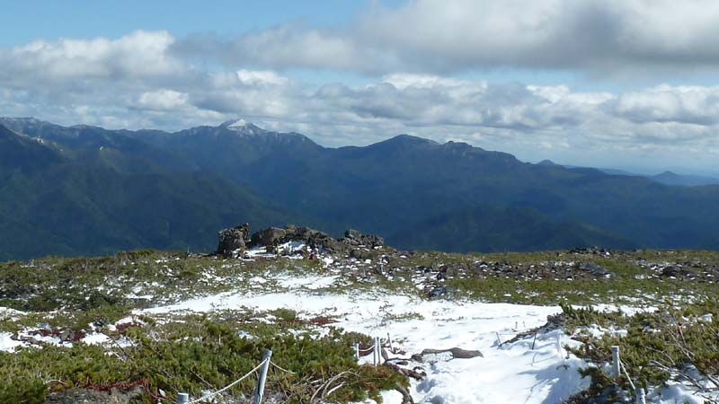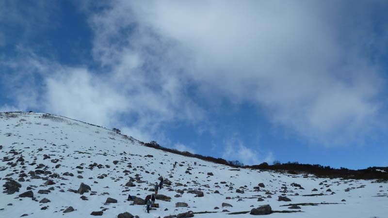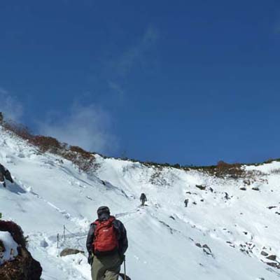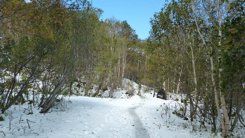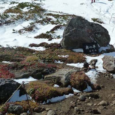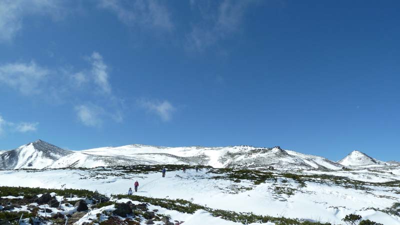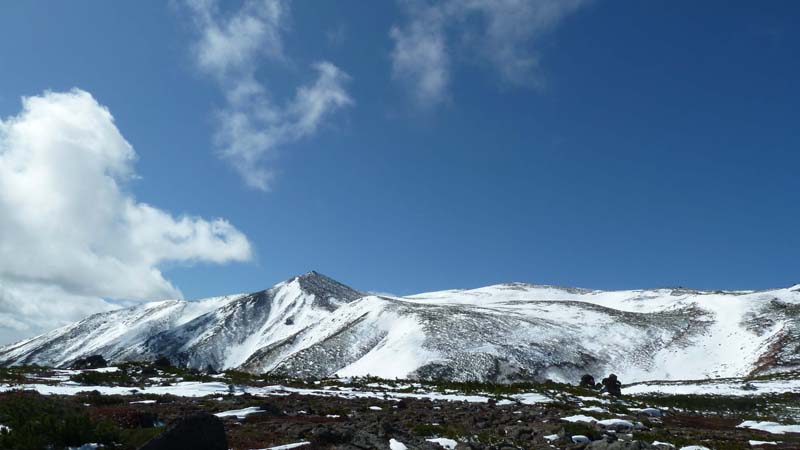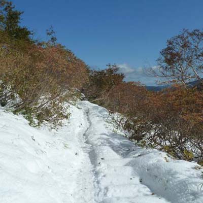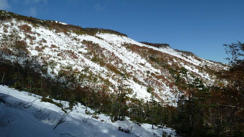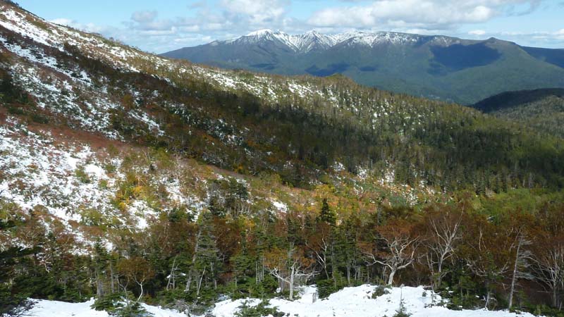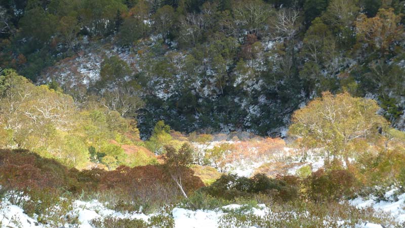 この時期、大雪山ではマイカー規制が行われ、銀泉台にはシャトルバスが運行されている。ところが前前日この時期ではめったに無い大雪(銀泉台で25cm)がふり、昨日は シャトルバスは運行停止となった。さて、今日は運行されるか?心配しながらレイクサイドのバス発着場に向う。幸いバスは運行されていた。 今日は天気が良い。さて、どんな景色が見られるだろうか?バスを降りると、道は銀世界。 ( 銀泉台の登山口 雪道だ!) 第一花園の展望場所に着く。例年紅葉の見事な第一花園はくすんだ赤と雪。少し残念!。でも、新雪のニセイカウシュッペが輝いている。 ![]() ( 第一花園・・・くすんだ赤と雪、がっかり! ) ![]() ( 新雪のニセイカウシュッペー左端 が輝いている ) 第一花園に到着。雪道が続く。 ![]() ( 雪に覆われた第一花園・・・雪道が続く ) 新雪のニセイカウシュッペ美しい。 ![]() ( 紅葉とニセイカウシュッペ ) 第二花園に到着。雪の大平原になっている。石の隙間に足をとられ、歩きづらい。 ( 第二花園は雪の大平原 ) 奥の平に到着。ここは日当たりが良いのだろう。チングルマの紅葉が見られた。 ![]() ( 奥の平、雪の斜面をトラバース) 駒草平に到着。広がる銀世界に興奮する。 ![]() ( 駒草平 ) (駒草平から赤岳方面、道は第三雪渓へ向う ) ![]() ( 東岳、登山道からは離れているが美しい姿で印象に残る山 ) ( 駒草平のシンボルの岩峰。その上に武利岳ー中央 と、武華山ー右が聳える ) 駒草平の展望を楽しんだあと、名残りの紅葉と雪のコントラストを楽しみながら下山する。 ( 紅葉とニセイカウシュッペー左端 ) ( 第一花園の紅葉 ) ( 第一花園からの谷の紅葉 ) |