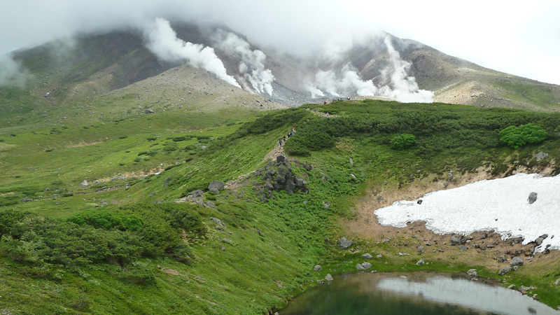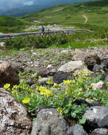 初夏の大雪山、旭平(姿見の池)の散策を計画する。 例年より遅れたので、チングルマの最盛期は過ぎているかも? ロープウエイを降りるとすぐに残雪とお花畑。ツガザクラ、コザクラが可愛い。 ツガザクラが可愛い 奥にコザクラの群落 姿見の池へ向かう。チングルマの群落も最盛期は過ぎている。 チングルマは最盛期は過ぎている 姿見の池が姿を現す。旭岳の山頂は雲に覆われている。 展望台の周囲にはイワブクロがたくさん咲いていた。控えめで上品な花だ。 イワブクロは北海道では樽前山に多く見られるのでタルマイソウとも呼ばれる。 姿見の池。旭岳の山頂は雲 上品な色合いのイワブクロ 遠くにロープウウェイ駅が見える 姿見の池を後に夫婦池へ向う。振り返ると旭岳の噴煙が立ち上っている。 今日は噴煙の量が多いように思う。夫婦池が見えてきた。 旭岳の噴煙 夫婦池 (左:すり鉢池 右:鏡池) 夫婦池から裾合平のチングルマの群生地に向かう。残念!チングルマは綿毛の状態だった。 綿毛のチングルマ 夫婦池に戻る。旭岳の山頂は相変わらず雲に覆われている。 夫婦池から見るもう一度旭岳を見る ロープウエイ駅へ向かう。途中の満月沼の周りのお花畑が美しい。 満月沼の周りのお花畑・・・チングルマとツガザクラ エゾコザクラのお花畑 この山旅で会ったお花たち。 ![]() ( チングルマとツガザクラ) ![]() ( ミヤマリンドウとコマクサ) ![]() ( アキノキリンソウとメアカンキンバイ) ![]() ( イソツツジ ) |