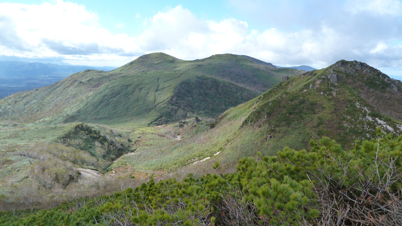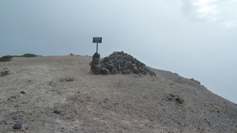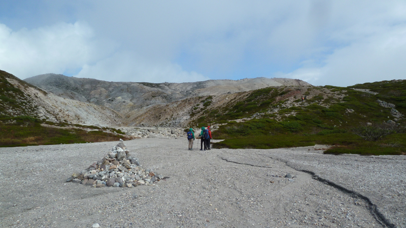紅葉を求め、例年のニセコ登山を計画。今年はどうか・・・。五色温泉インフォメーションセンターの駐車場の少し上にある 駐車場に車を止める。こちらの方がすこし上なので登りは楽。曇り、ガス、小雨。ちょっと心配だが登山開始。 振り返るとニセコアンヌプリはガスの中。すでに落葉は終わり? ![]() ( ニセコアンヌプリはガスの中 ) 登り始めの急階段が見える。あの階段がけっこうつらい。 ( 最初の急階段・・・けっこうつらい ) 階段を登り切り、さらに少し岩の道を登ると平らな登山道になる。しばらく行くと見晴らしが開け、 ニトヌプリの双頭峰が見える。右側が山頂。 ![]() ( 平らな登山道を進む ニトヌプリの双頭峰が見える ) さらに進むとケルンの広場に到着。高山ムードが漂う。 イワオヌプリの側面は見えるけれど山頂は奥で見えない。左手にこれから登る登山道の尾根が見える。なだらかに見えるけれどけっこう急なガレ場だ。 ( イワオヌプリの側面 左手はこれから登る登山道の尾根) 大沼の分岐を過ぎ、いよいよ急な尾根道のガレ場を登る。 ( 急な尾根道のガレ場・・ここを登る ) ガレ場を登りきると噴火口に着く。ガスってよく見えない。火山灰なので道はわからない。少し不安はあるが何度も登った道なので適当に登る。 山頂が見えてくる。 ![]() ( 左:噴火口の砂原 右:山頂が見えてくる ) イワオヌプリの山頂に到着。ガスの中展望は全くない。 (イワオヌプリの山頂、ガスの中展望は全くない ) 早々に下山。噴火口まで下ると急にガスが晴れ。山頂、外輪山がはっきり浮かび上がる。 ( 平らなイワオヌプリヌプリ山頂ー右端ーが見える ) ( 噴火口と外輪山、登山者が見える ) 展望を楽しみながら下山。ギザギザの登山道のニトヌプリ、眼下にはコイワオヌプリ、ニセコアンヌプリもその雄姿を現した。 ![]() ( ニトヌプリと右端はコイワオヌプリ ) ( ニセコアンヌプリ ) |