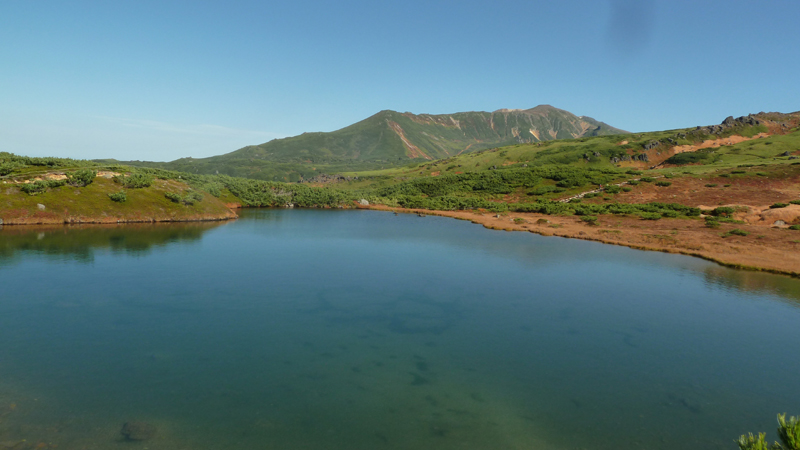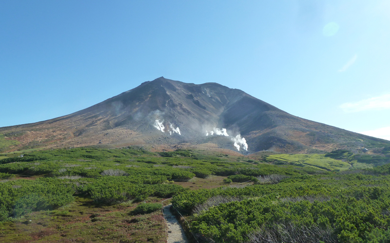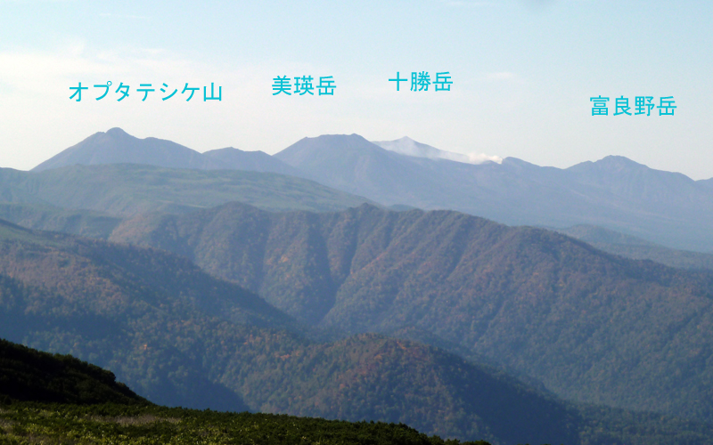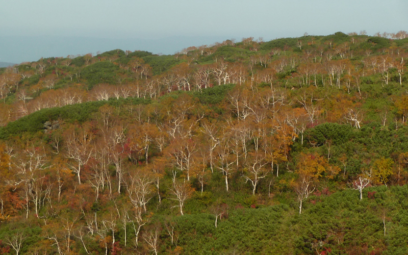 晩秋の大雪山、今年は夏に天候が悪く予定が中止となり、今年初めての旭平(姿見の池)の散策。紅葉の最盛期は過ぎているようだ。 ロープウエイに向かう道の白樺の木々の黄葉が美しい。有名な山の歌「エーデルワイスの歌」の「秋」の一節を思い出す。黄葉の白樺を美しい女神と表現した作詞者の気持がわかる気がした。 「♪ 金と銀とに 装いこらし 女神のごとき 白樺の森 ♪ 」 ロープウエイに乗り姿見の池へ向かう。眼下に紅葉の森。 紅葉とハイマツの緑が美しい。 ロープウエイ駅から姿見の池へ向かう。正面に旭岳。 堂々と聳える旭岳 右手に十勝連峰の山が見える。 十勝連峰の山 夫婦池に到着。旭岳が大きく聳える。 姿見の池と旭岳 夫婦池へ向かう。左手の擂鉢池と右手の鏡池をあわせて夫婦池という。 鏡池に映る旭岳 鏡池からは安足間岳ー当麻岳の稜線が望まれる。あの稜線には高い高度にもかかわらずチングルマの大群落があった。 鏡池から安足間岳ー当麻岳の稜線を望む 第三展望台から旭岳の雄姿を眺め、ロープウエイ姿見駅へ向かった。 擂鉢池と噴煙を上げる旭岳 |