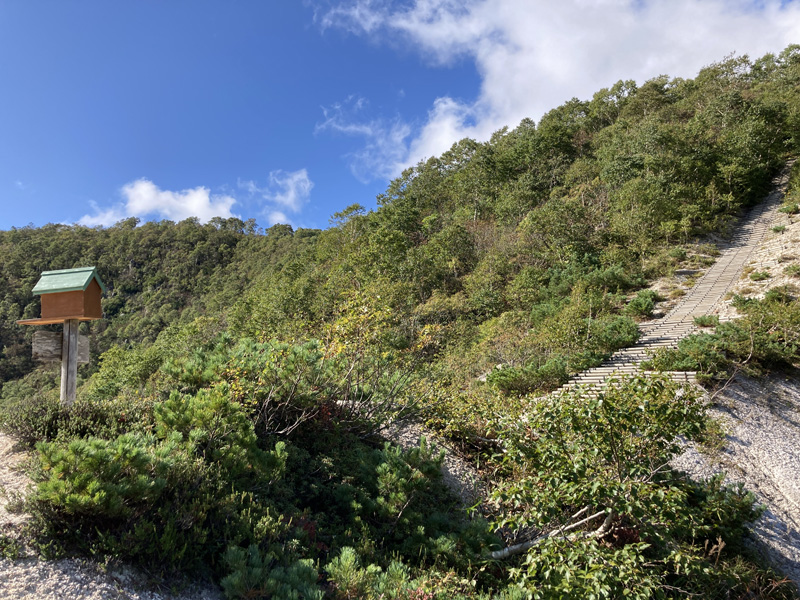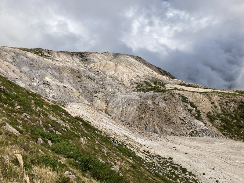 今年の夏は記録を更新する暑い日がつづき、9月に入ってもなかなか秋が来ない。それでも秋を探しに、例年のニセコ登山。午前中は雨だったので第2駐車場は ガラガラ。登山開始。早速、野菊(エゾノコンギク?)が迎えてくれた。菊は秋の訪れを教えてくれる。 ![]() ( 菊は秋の訪れを教えてくれる ) 登り始めの急階段が見える。あの階段がけっこうつらい。 ( 最初の急階段・・・けっこうつらい ) 入山届を記入して、振り返るとニセコアンヌプリ。ここ五色温泉から上る登山道もある。まだ紅葉はない。 ![]() ( ニセコアンヌプリ この山の山頂からみる羊蹄山は美しい) 階段を登り切り、さらに岩の道を登ると平らな登山道になる。しばらく行くと見晴らしが開け、 ニトヌプリの双頭峰が見える。。。 ![]() ( ニトヌプリの双頭峰が見える 右側が山頂) さらに進むと大沼分岐前の広場に到着。イワオヌプリの山頂は奥で見えない。左手の尾根をこれから登る。 なだらかに見えるけれどけっこう急なガレ場でこのコースの最大の難所だ。 ( イワオヌプリの側面 大沼分岐はこのすぐ先にある) 大沼の分岐を過ぎ、急な尾根道のガレ場を登る。左側にコイワオヌプリとニトヌプリ。ニトヌプリのギザギザの登山道が見える。 ( 双頭峰のニトヌプリと尖峰のコイワオヌプリ ) ガレ場を登りきると火口入口に着く。正面にイワオヌプリの平らな山頂が見える。 ![]() ( 火口から見るイワオヌプリ ) イワオヌプリの山頂までは火山灰の道。山頂に到着。今日はニセコアンヌプリは雲の中で見えない。 (イワオヌプリの山頂を目指す ) ( イワオヌプリの山頂 ) 火口を一周するコースで下山する。大沼とワイスホルンが見える。 ( 火口と外輪山 中央雲の中に見える山はチセヌプリ ) ( 大沼とワイスホルンー 遠くに岩内港 ) 眼下に二つの火口。 イワオヌプリの噴火活動は9500年前頃と言われている。 ![]() ( イワオヌプリの雄姿・・・山頂に人影) ( 二つの火口 ) 雄大なイワオヌプリを見て一気に下山・・・ではなくて秋の実を見つけながらゆっくり下る。 ![]() ( オオカメノキの実 マイズルソウの実 ) ![]() ( シラタマノキ ツバメオモトの実 ) |