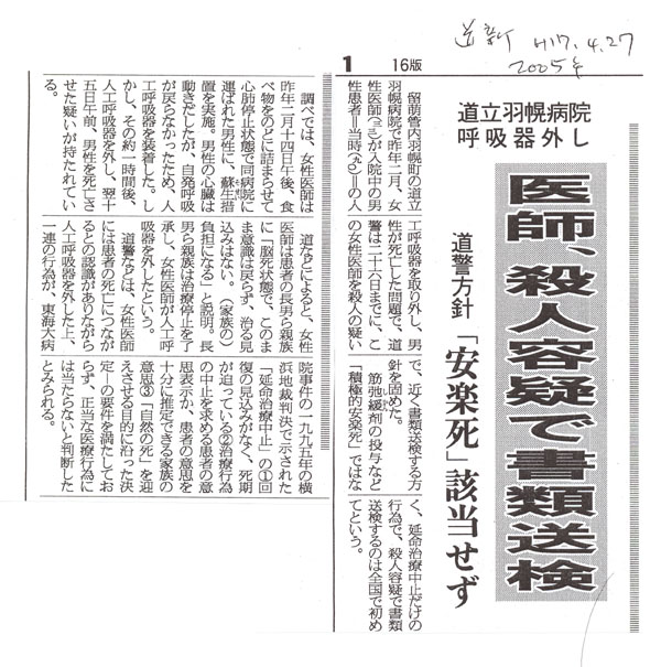 道立羽幌病院で、救急患者として搬入された90歳の男性を蘇生し、いったんは呼吸器を装着した医師が 脳死の状態と判断、家族の同意のもと、呼吸器をはずした行為が事件として報道されている。 北海道新聞