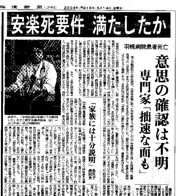 朝日新聞の報道 北海道羽幌町の道立羽幌病院(佐藤卓院長)で2月中旬、当時勤務していた女性医師(32)が 無呼吸状態に陥った男性患者(90)の人工呼吸器を取り外して 死亡させていたことがわかった。医師が家族に「脳死状態は変わらない」と告げ、 家族が延命措置の中止を希望したという。 しかし、実際に厳密な脳死判断をしていなかった疑いがある。 北海道警は殺人容疑で、医師から事情を聴くなど捜査を始めた。 病院側の説明によると、男性患者は2月14日午後0時40分ごろ、 自宅で昼食をとっていた際、のどに詰まらせ、家族が救急車を呼んだ。 同1時10分ごろに病院に搬送された際には、心肺停止状態だったという。 医師が蘇生措置をした結果、約30分後に心臓は動き出したが、 自発呼吸はできない状態のままだった 医師は自発呼吸停止と瞳孔の拡大から脳死状態と判断し、 患者の長男に告げた。その際、長男の希望で人工呼吸器を装着したという。 患者は翌朝、改善の兆しがないまま状態は悪化。 医師が「状態が悪く、脳死状態は変わらない」と家族に告げると、 「元に戻る希望がないなら延命措置はやめて欲しい」とこたえた。 午前10時40分ごろ、親族3人の立ち会いのもと医師が呼吸器を外した。 男性は約15分後に死亡したという。 亡くなった時点で、医師本人が医師法に基づき、 「異状死」として羽幌署に電話で報告したという。 医師は別の医療機関から02年5月から先月末まで、 羽幌病院に派遣されていた。 家族の気持ち・・・道新の続報 「女性医師、なお信頼」 死亡患者家族、病院説明を肯定 羽幌病院の呼吸器外し 2004/05/15 01:30
