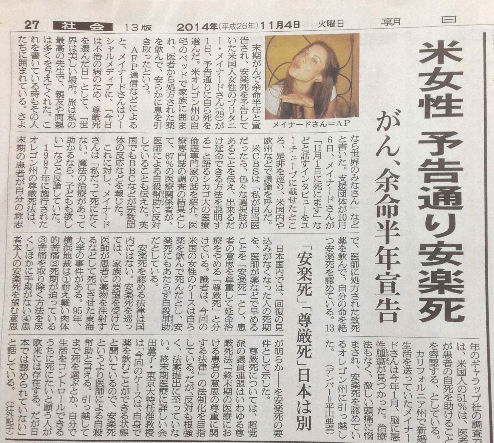 安楽死か?尊厳死か?それとも自分で服薬したから自殺か?そういう言葉で決めつけることは出来ない。「安楽死を自分で決める権利を認めるか」さらには「個人は死ぬ権利を持っているか」という問題が根底にあると思う(H26.11.14)