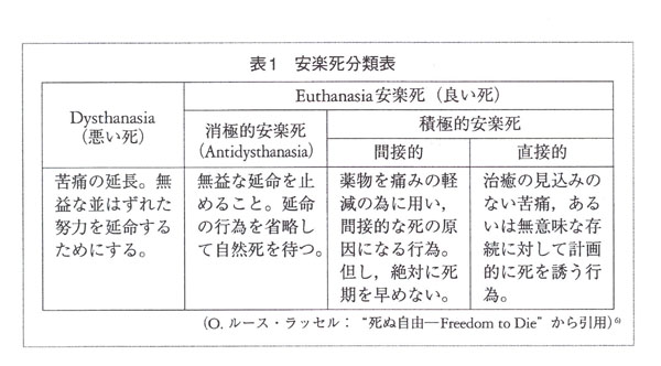 安楽死にはいくつかの分類がなされているが、O.ルース・ラッセル卿の「Freedom to Die」 の分類はよく引用される。 彼は「Dysthanasia」(悪い死)と「Euthanasia」(良い死=安楽死)に大別し、後者を 「消極的安楽死」と「積極的安楽死」に区別している。 一方、「尊厳死」(death with dignity)とは、一般に、回復の見込みのない病者に無益な延命処置 を施すことをやめ、彼に”人間としての尊厳”を保たせつつ、死を迎えさせることをいう。「自然死」 (natural death)ともいう。前述の安楽死分類の「消極的安楽死」(Antidyssthanasia)と同意と 理解してよかろう。 |