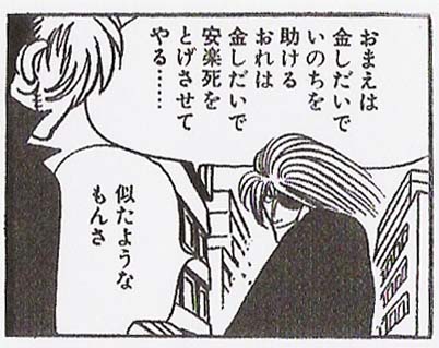 手塚治虫の人気漫画ブラック・ジャック。夢の手術で人を助ける天才外科医ブラック・ジャックの話であるが、 天才・手塚治虫は、なぜか、ブラック・ジャックに高額な手術代を請求するという非道徳性をもたせた。 ブラック・ジャックを神としてではなく、人間の世界に戻したのか、それとも、医学には金がかかると考えたのか、 それとも、一人の力で救える病人は限りあり、高額な医療費を病人を選別する手段としたのか、 高度な技術にはそれ相当の対価を要求できると思っているのか、その真意はわからない。 ただ、世の中のうわさと異なり、実際はブラック・ジャックは金では動かず、人間愛で動いている。