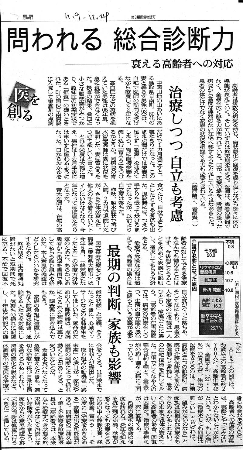 この朝日新聞の記事は、高齢者の病気への対応の難しさを簡潔に記載している。実際に診療していると、入院中であっても、対応に苦慮することも多い。一方で、厚生労働省は在宅医療を進め、自宅での看取りを望ましいと推奨する。それは医療費を少なくすることが主眼であることは明らか。看取りまで考えた在宅医療が行なおうとすれば、現実に自宅で看取れるのはごく一部の恵まれた家庭であり、多くの人は家族の犠牲の上に療養を続けることになる。医学的な適切な判断も難しいだろう。すべての原点は「生命の尊厳」であり、命を粗末にする考えは認められない。「尊厳死」も「安楽死」も命を大切にする観点からはじめて認められるものであろう。 |