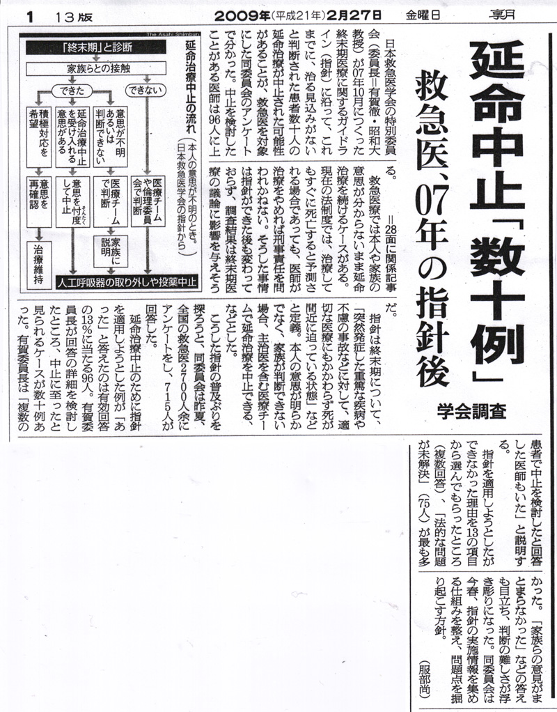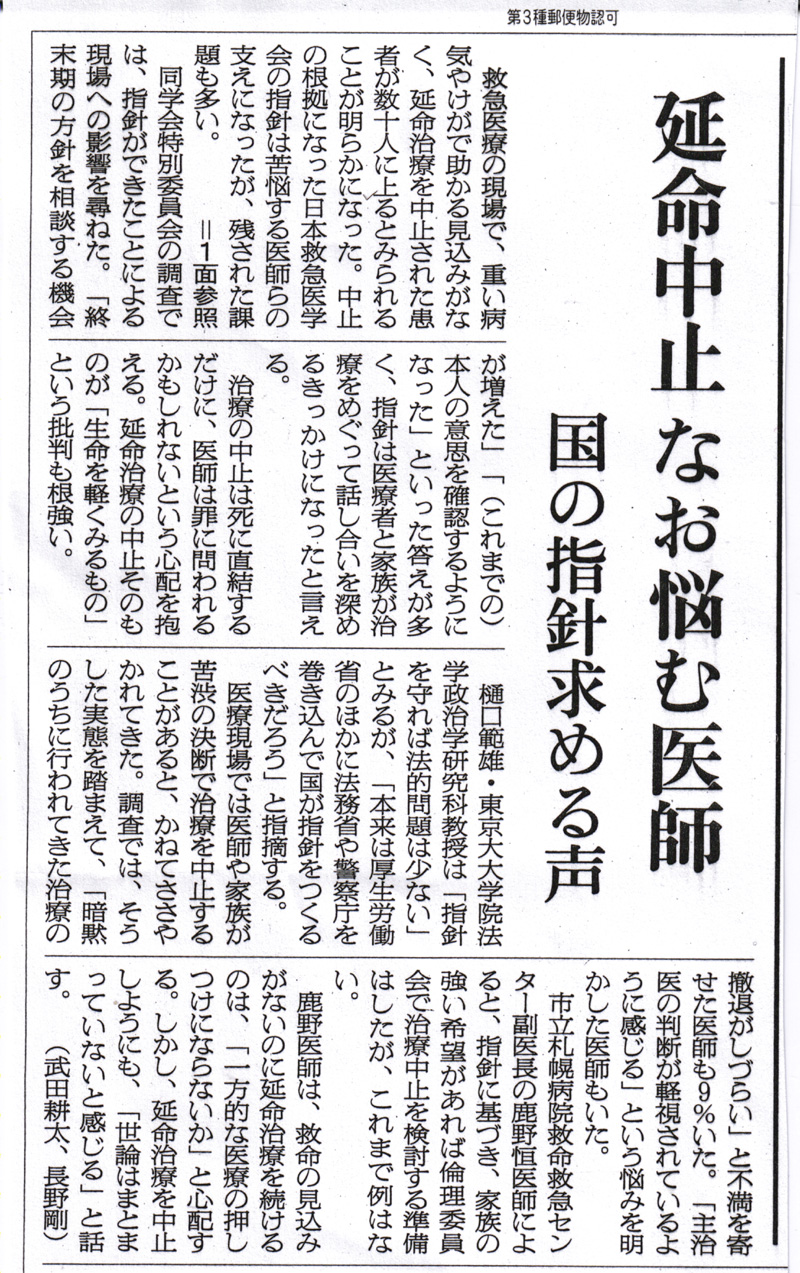 救急医学会: 延命治療の中止「数十例」ー 指針制定後 ー |