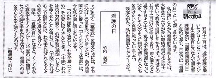 これは北海道新聞の記事である。この記事を読んで、ずいぶん前のことが思い出されました。 僕の詰め所に看護婦さんの娘が新卒の看護婦さんとして配属されてきました。看護婦さんの家で生まれ、本人も看護婦さんを目指したということなので 、その新卒のナースに聞いてみました。 「いよいよ白衣の天使だね。」 その答えは予期に反したものでした。 「看護婦は白衣の天使ではありません。」 ちょっとびっくりして 「え! 違うの??」 僕は、笑って、それ以上は聞くのはのをやめました。僕の期待は、やっぱり「そう(天使)なりたいわ。」とか、せめて「私には無理よ。」 という答えであったように思う。 彼女が何を言いたかったのか、その後も詳しく聞かなかったのでわかりませんが、 いま振り返り、推測すると、「職業としてナースを選んだのであって、 白衣の天使になるためにナースを選んだわけではない。」と言いたかったような気がします。実際にまわりの看護婦さん(最近は男性の看護師さんも多くなったが)を見渡すと、しっかりもの、おっちょこちょいな人、優しい人、ちょっときつい人などさまざま。忙しい看護の仕事で、仕事に追われ、とても白衣の天使になれるような状況ではないように思う。今の世の中、白衣の天使になって、献身的に働きなさいとは無理な注文でしょう。 そんな気持ちでいた最近でしたから、この新聞記事を読んで、ちょっとうれしくなりました。白衣の天使になろうとしている看護婦さんもきっとたくさんいるのでしょう。ただ、ナイチンゲールの誓詞の一節に「心より医師を助け・・・」がある。看護婦さんに期待する前に、まず、自分自身が患者さんや看護婦さんに信頼される医師になるのが先決ですね・・・。 |