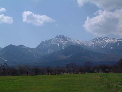 正面が主峰の赤岳、その右側が横岳。 赤岳の左肩に尖がった岩峰は竜頭峰。 赤岳山頂からちょっと右側の2等辺 三角形の山は県界尾根の末端。 左側のふたコブは真教寺尾根、奥のコブが牛首山。 県界尾根、真教寺尾根とも野辺山側からの赤岳直登ル−ト。 吉川喜次氏撮影 (2003.4.28)